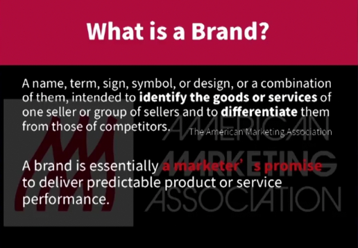 品牌是一组可以用来辨识一个产品或服务的制造者或销售者,并能用来与其竞争者产生差异化的元素。——美国行销协会。